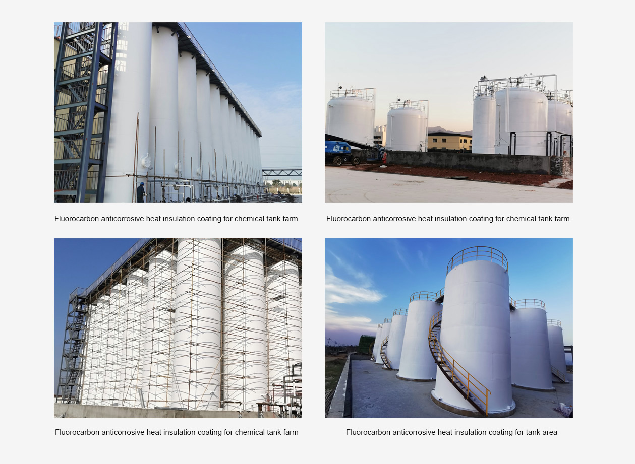 Features: This is a functional anti-corrosion coating with dual functions of anti-corrosion and heat insulation specially developed for special media equipment that chemical companies need to take cooling measures. Through its reflection function of infrared rays, it can achieve the effect of surface cooling. The rate reached over 86%. In the state of steel equipment without medium, the surface temperature of the equipment in summer generally does not exceed 42 degrees, and the effect is very obvious.